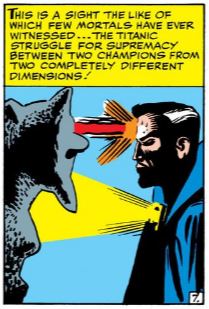 And so he confronts the ruler of the purple dimension, Aggamon. I was suprised when I saw this character because it sounds like a villain who would be antagonizing Strange for decades, but I could not remember ever seeing him. After some research, he really is only limited to just six appearances across all of Marvel comics. You would think a ruler of an entire dimension would get more play. At any rate, Strange gets into another staring contest and wins. It is not as epic though because each combatant only has one beam.