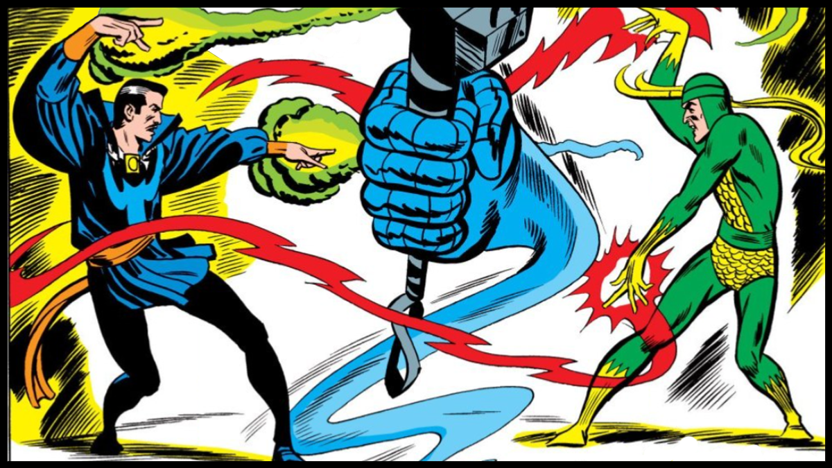 So in Strange Tales 123, the God of Mischief Loki is up to his tricks again. This time he thinks he can manipulate our hero Doctor Strange into defeating his half-brother Thor once and for all. In the current status-quo, Loki has messed around one too many times and Odin has banished him to remain in Asgard. So he uses his magic to project himself in Doctor Strange’s home, under the illusion that he has been imprisoned. Loki claims Thor has done this to him and he must be defeated. Strange scans him to confirm the evil that binds him. That evil is actually the heart of Loki himself but he doesn’t realize it yet. Giving Strange a sliver of Thor’s hammer’s thong, he is able to cast a spell which thrusts the hammer away from Thor mid flight.
