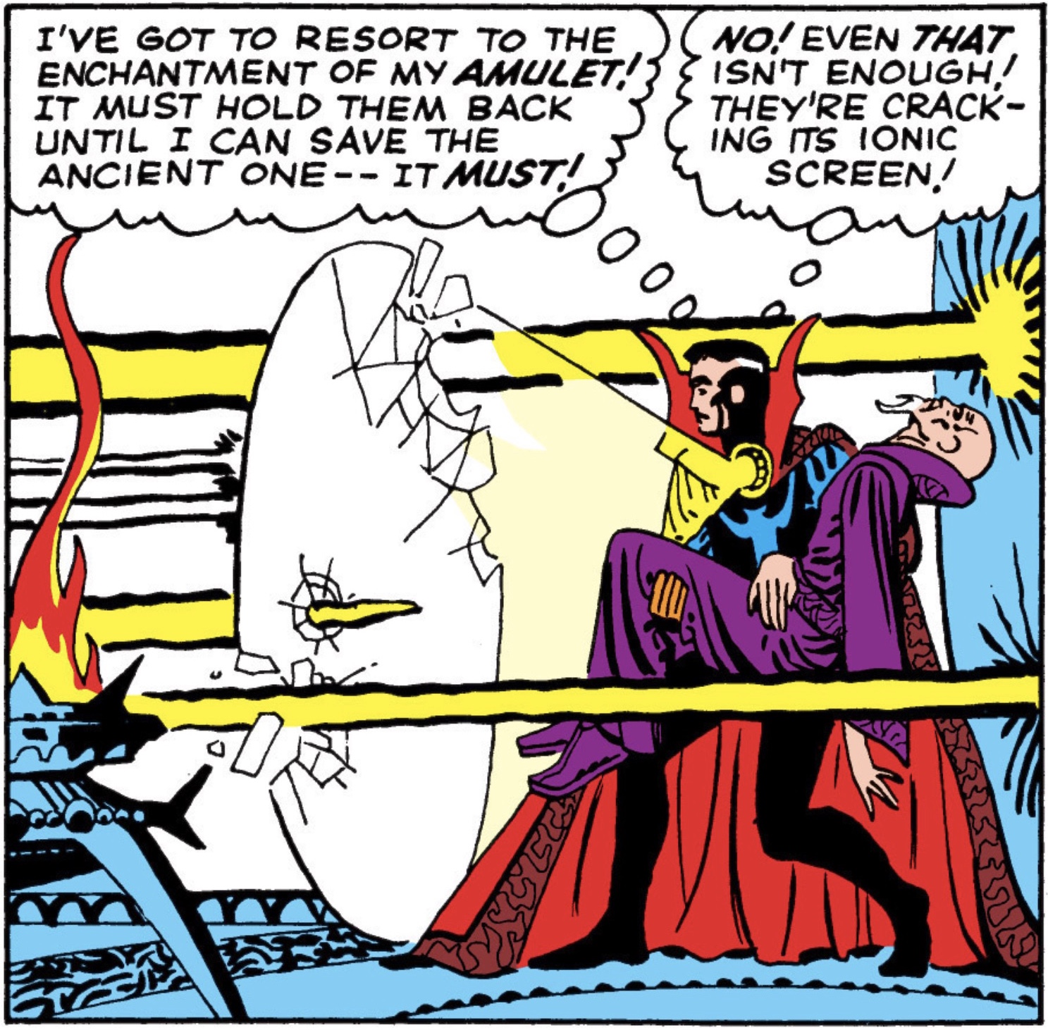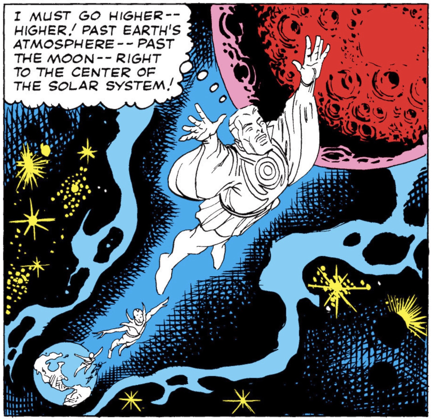 Meanwhile, Strange is getting surrounded and is forced to lead Mordo and all his astral projection companions up into space. He plays a game of chicken with Mordo by heading directly into the sun which is has some great visuals. Mordo is concerned that the astral form can be affected by the atomic energy at the source of the sun. His minions bail on him in mass and eventually he psyches himself out and retreats. The bluff worked and Dr. Strange takes a different route home to be with the Ancient One again. He briefly awakes from his coma and tells Strange that he must find Eternity before passing out again.