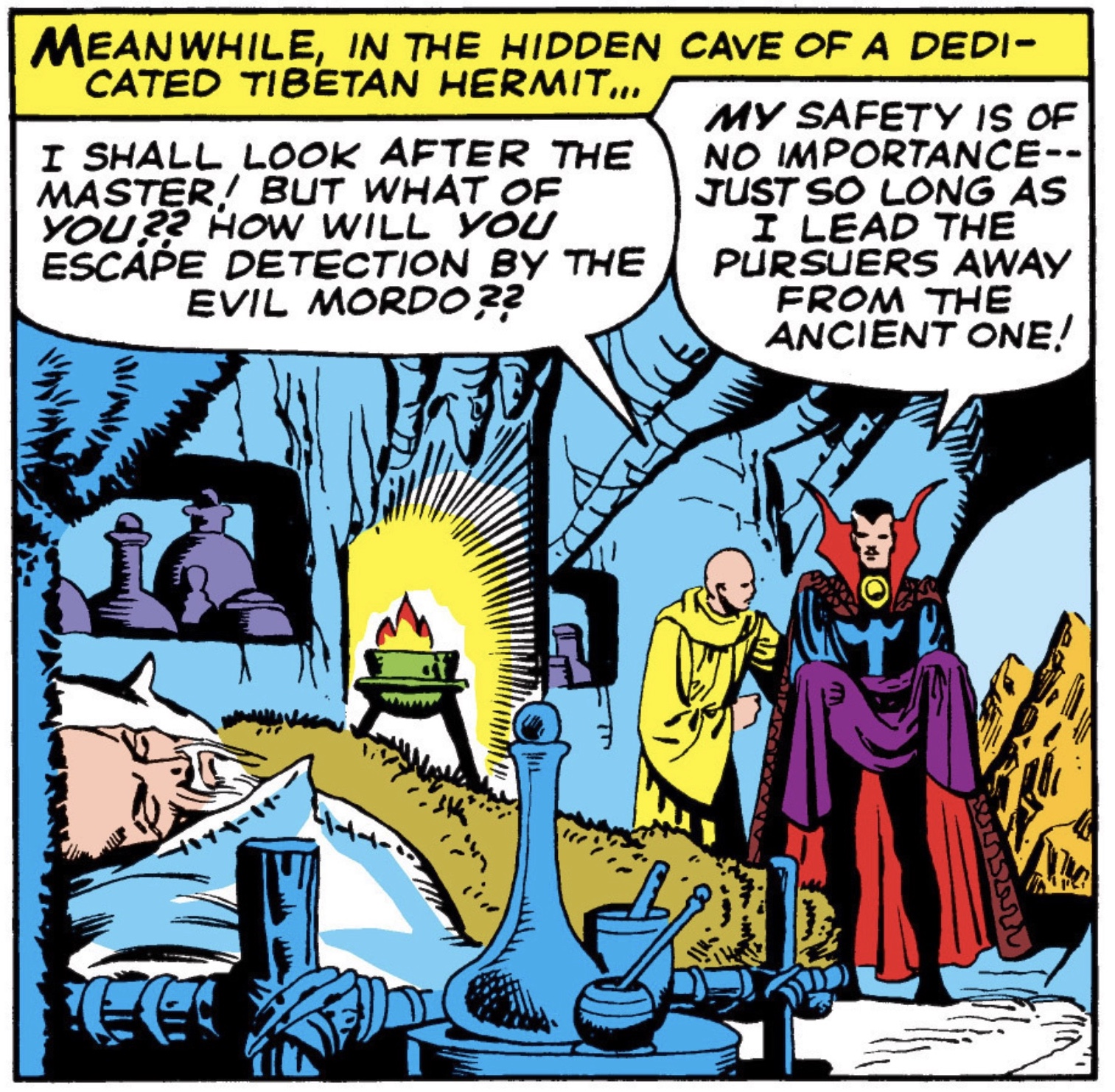 We must be at the point of Marvel’s history where they started to abandon single issue plots and moved into much more entertaining multi-issue storylines that leave lingering plot threads to pick up in even later issues. This arc has Baron Mordo back, but this time he has made a pact with the recently defeated Dormammu. Getting right into the action, Mordo and his disciples assault the Ancient One’s temple where Dr. Strange was training with him. In a series of dynamic panels, the empowered Mordo is too powerful and Dr. Strange barely escapes with the Ancient One mortally wounded in his arms. He sneaks off to a hidden cave and leaves the Ancient One in the care of a Tibetan hermit.