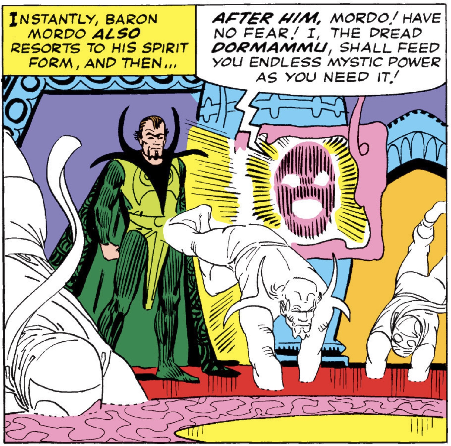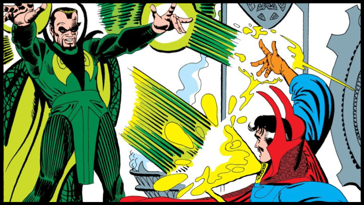Using the robes of his master, Dr. Strange is able to trick Mordo and his men into following him to China, throwing them off the trail of the Ancient One. Grounded in Hong Kong, Strange switches to civilian clothing in an effort to sneak out of the city. Mordo, who is really growing impatient, puts out a telepathic help wanted ad to any evil mystic arts users in the area.