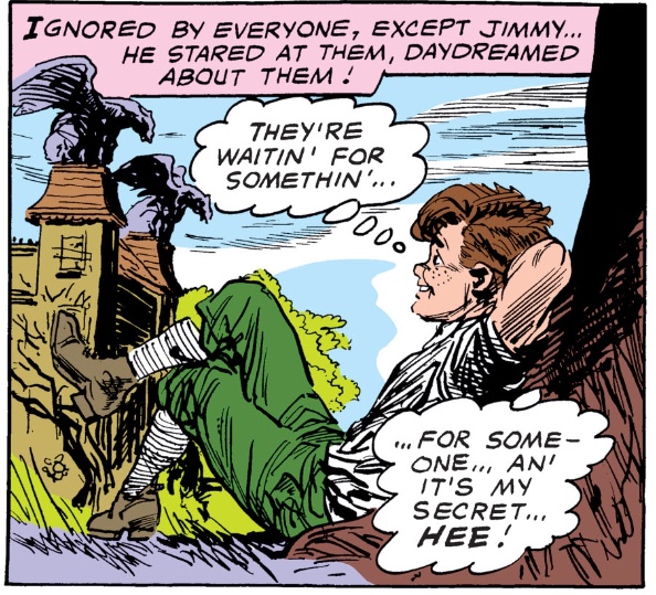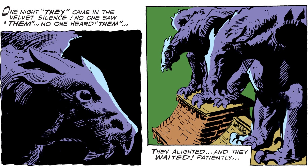 The second story is titled “The House of Gargoyles” and I think it’s the more interesting one. It starts with a French man moving into a small American town and getting a room at the local inn. Overnight, two large ominous gargoyles appear on the roof of the building and the French man refuses to leave his room. The townspeople are appalled at the eyesore of the two statues but a young boy named Jimmy is fascinated by them.