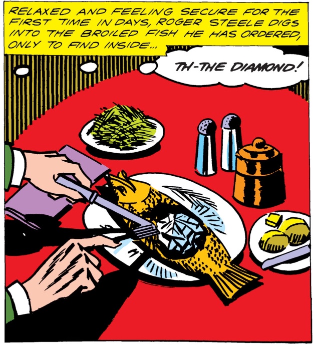 Thinking he got rid of it successfully, he celebrates that night at a fancy restaurant only to find the diamond inside of the fish he ordered. Cursed or not, at this point he is freaking out and is trying to figure out what to do next when he is mugged in an alley. The robber takes the diamond from him, ignoring his ridiculous warnings of it being cursed. The robber flees out of sight and a mysterious noise is heard. The cops and the young man catch up to the robber to find him dead and the diamond missing. The police inform the man that the robber was a criminal who had escaped prison and was scheduled to be executed at this exact time… what a coincidence.