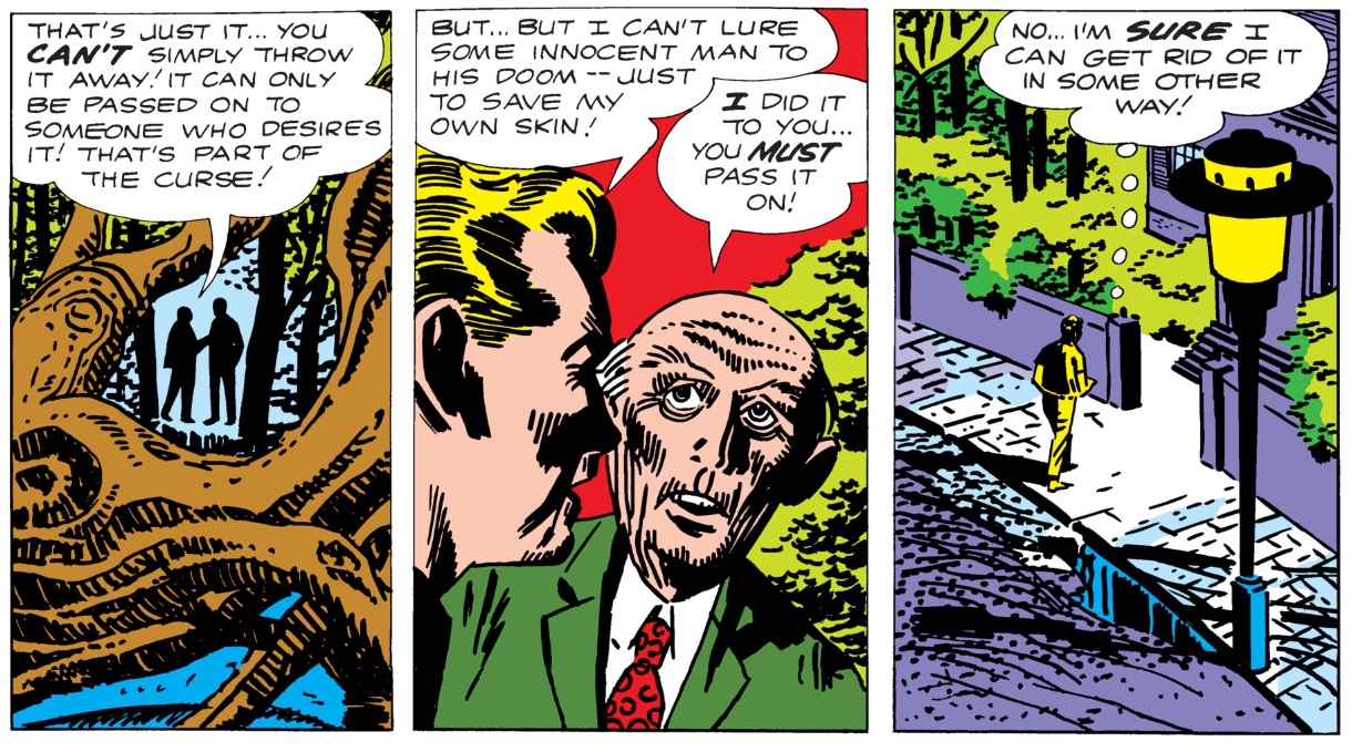 This issue immediately introduces us to a character named Cain. He is the “able care taker” of the House of Mystery who acts as host for the stories in each book – much like the Crypt Keeper (more biblical in origin). He would stay with the series until it finishes and ends up being used by Neil Gaiman in his iconic series Sandman much later. Each issue consists of two longer 8 page stories, and a variety of extra content like short written stories or fun interactive one pages. The first of the two bigger stories titled “The Gift of Doom” is about a young man who is gifted a cursed diamond. A stranger comes knocking on his door in the midnight hour offering the gem to him for free. He gladly accepts it without question and leads the stranger back to the street where he is about to get run over by a truck. The young man saves him and the stranger questions his kindness, revealing the diamond is cursed. If he doesn’t pass it along to someone else he will die. It’s very amusing that he believes the stranger at face value and proceeds to try and get rid of the diamond even though there are no immediate ill effects from it.
