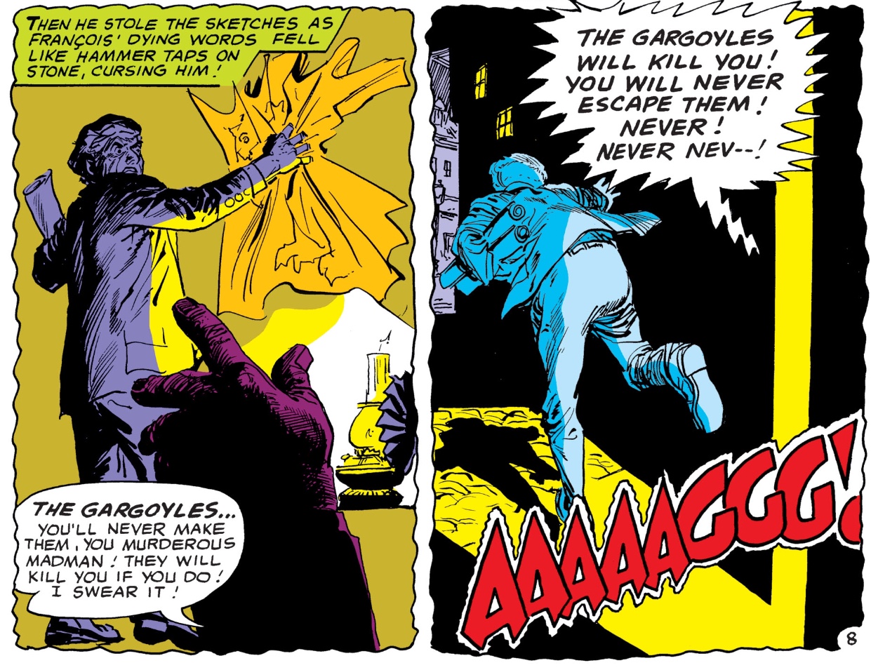He has a hunch that they are waiting for something but he doesn’t know what. So he goes to the inn and is led up to the room with the French man inside. Knocking on his door, the man inside refuses to answer. From the hallway Jimmy shouts asking about the gargoyles that showed up which sends the French man into a serious PTSD flashback. It is revealed to the reader that he used to be a struggling sculptor whose lover left him for a much more talented competitor. In a jealous rage, he broke into the other man’s studio to steal his super awesome gargoyle blueprints (is that something you have plans for?). The man was there though, and so in his rage decides to murder him in cold blood. With his dying breath the other sculptor threatens that the gargoyles will kill him if he ever creates them.