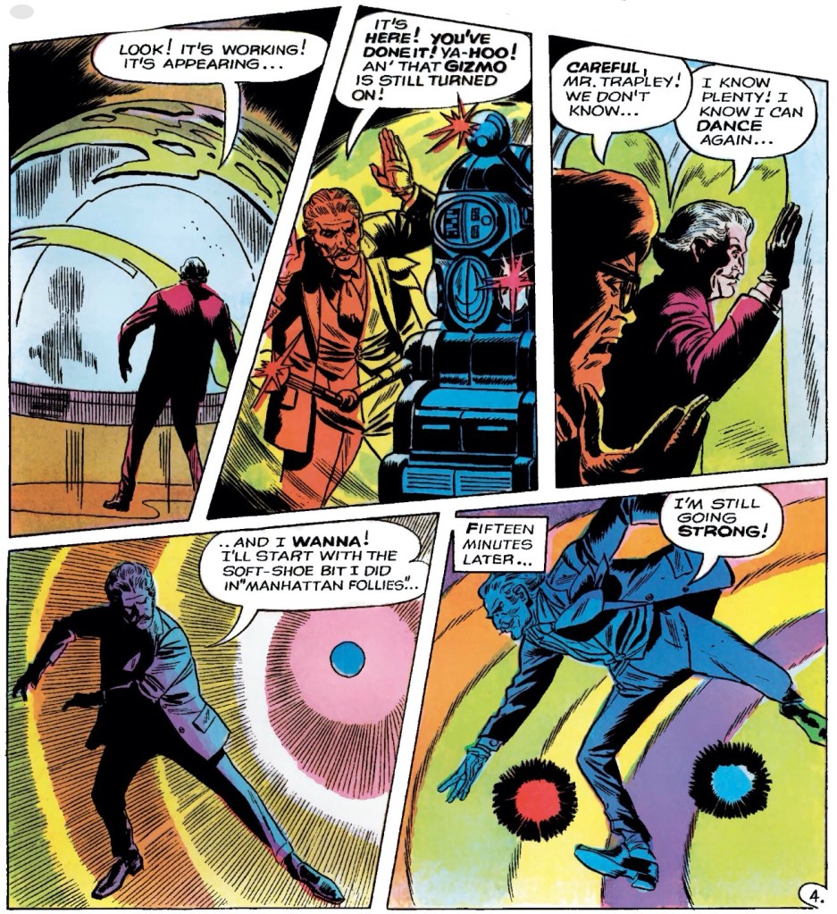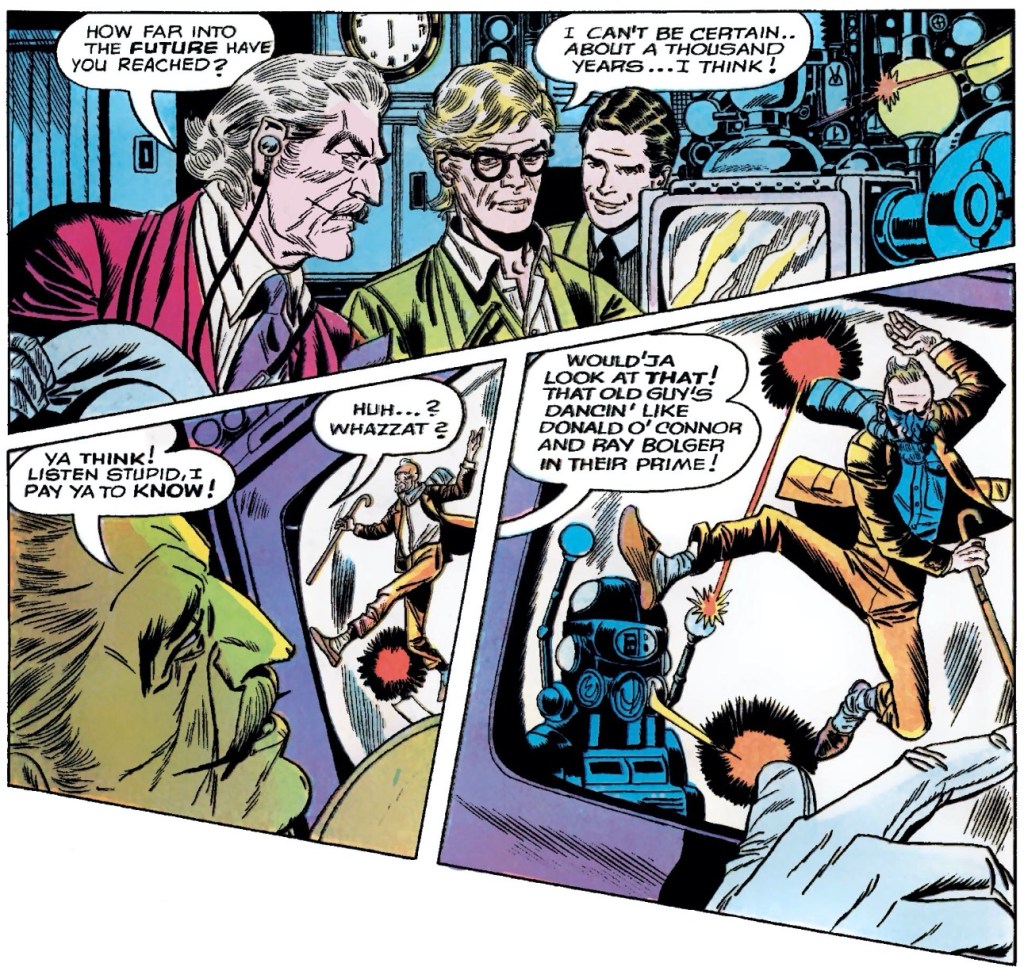 The first story is called “Save the Last Dance for me!” and is about Thurgood (Tin Toes) Trapley. A millionare dancer who has used his massive fortune to invest in time travel to the future. His group of hired scientists are able to make great strides in this endeavor, giving him a glimpse into the future where they confirm that old people are able to dance like they are in their prime. This is is fantastic news! He demands they accelerate the work on the time travel machine. One of the scientists warns that they can only use the machine once and to perhaps not waste it on dancing. Thurgood does not hesitate in punching the reasonable man in the face.