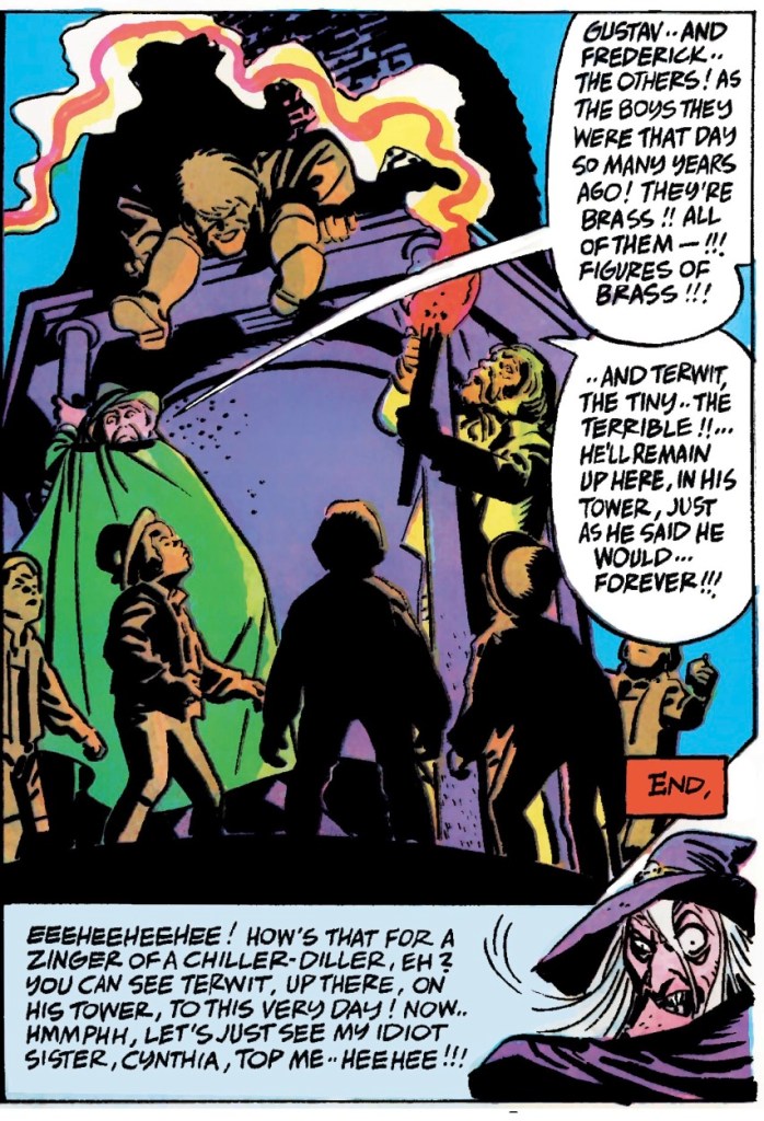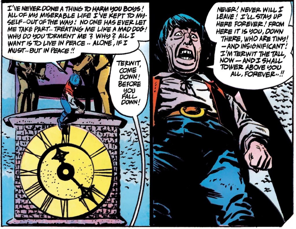 Our next tale, “Eternal Hour!” is probably the best of the lot but still a bit of a stretch. It is the story of Terwit the dwarf, who is mocked by the children of his town. He is up on the bell tower and refuses to come down. He swears he will stay up in the tower and that night a scream of pain can be heard by the villagers. From that day forward he comes out and threatens the people below, tossing large rocks and nearly killing them.