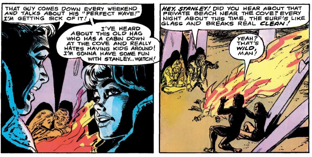 The last story is called “The Perfect Surf” and centers around Stanley the surfer obsessed beach boy and his steady girl Carol. Stanley is a simple man, always searching for the perfect wave. He drives by and picks up Carol to head to the beach to have a nice bonfire with some friends.