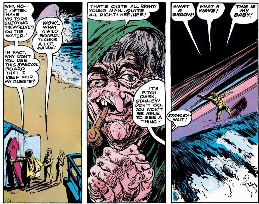 They find the woman who lives on the beach alone who can’t wait to sacrifice the young man. She allows him to borrow her “special” board and he takes off to the water despite the warnings of Carol. He finds his perfect wave, the only problem is that it is going the wrong way! He rides the wave towards the ocean, with a look of insanity on his face. I don’t think the world will miss Stanley. I hope the next issue improves in quality or maintains this level of crazy, either one will be very entertaining.