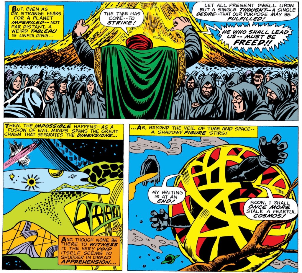 Dr. Strange rushes to the large gathering of these cultists to attempt to stop them. He puts up a good fight and distracts a lot of them but there are just too many and the ritual is finished. The last panel of the issue reveals the one who was freed: Baron Mordo! I feel like they could have left him in the oven a little longer, he was only banished to another dimension within the year of this publishing. Another big change almost immediately undone.