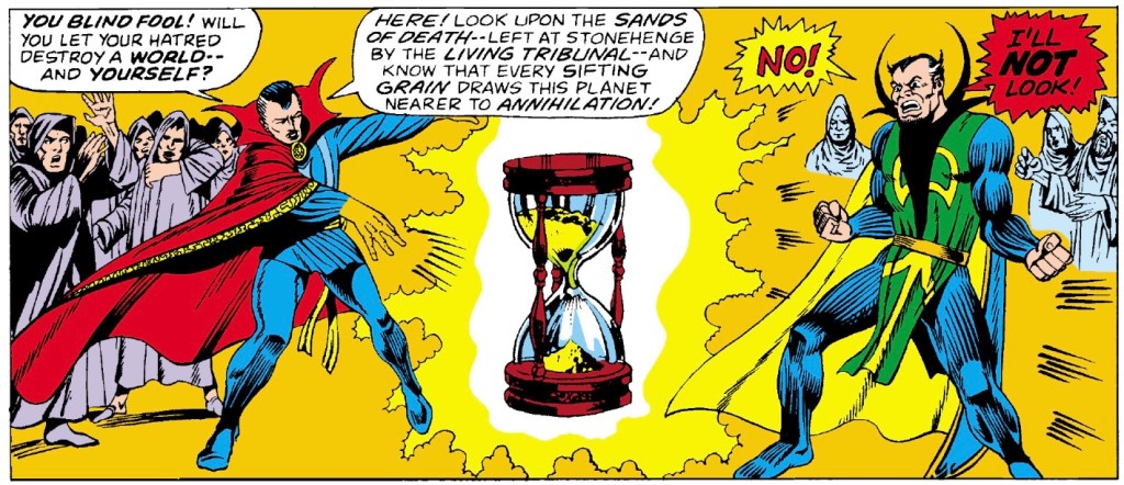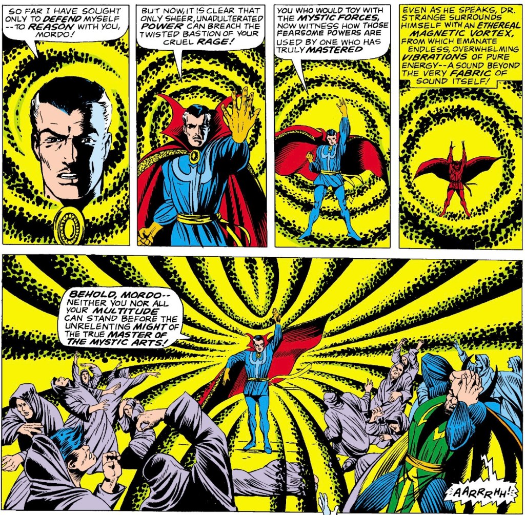 When the next issue picks up, Strange is now held captive by the cultists and is at the mercy of Mordo. While Mordo is whining that the Ancient One has passed on his powers to Dr. Strange in the event of his death, Strange is trying to explain the dire situation they are all in. He proposes a truce but Mordo won’t have any of it. He sends in all of his devout followers to kill Strange, but they are unorganized. Strange is able to find the cultist who started all of this and take him through a portal to a remote location. In isolation he is able to break the chain of mind control and suggestion that Mordo established. Learning how to deal with this mental infection, he returns to the group and performs a mass dispel.