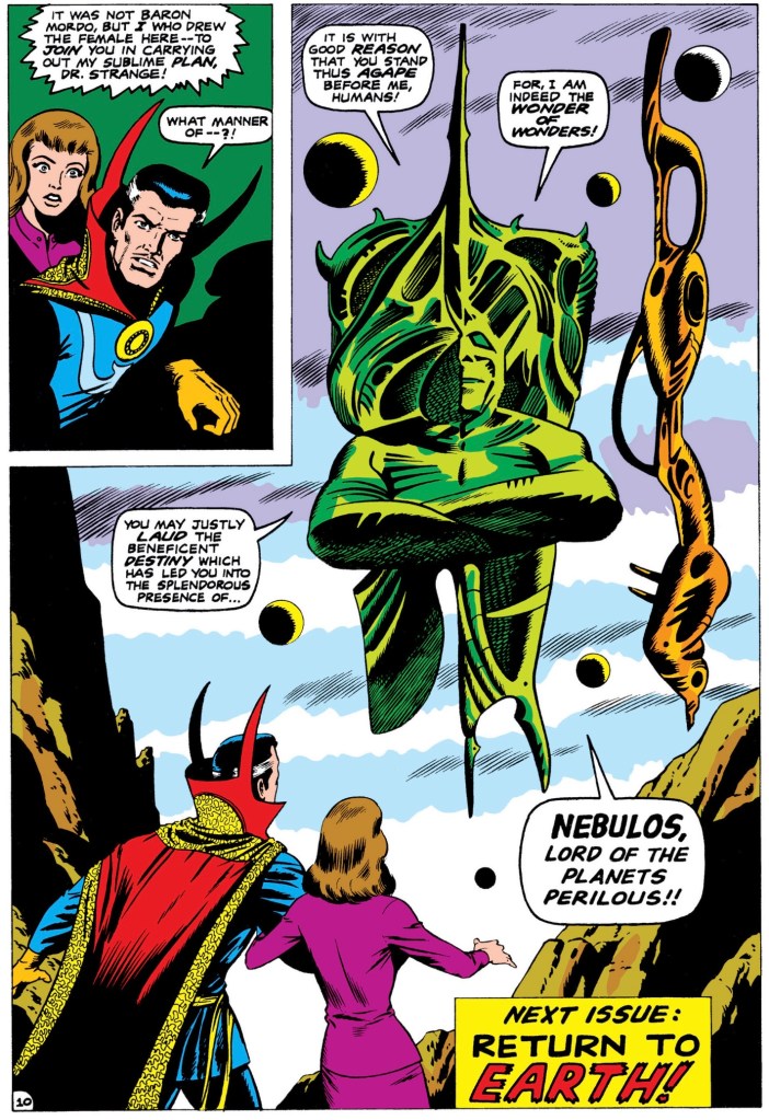 At any rate, Strange encounters her in the other dimension and recognizes her as Victoria Bently. He has a much better memory than I do. She is about to be eaten by a giant alien ant. He is able to wrestle it off of her using magic and they begin to piece together what is happening. Not long after though, a looming voice interrupts them from behind. Nebulos, Lord of the Planets Perilous reveals himself. What his purpose is, we will need to wait until next issue to find out. This arc is going in all sorts of places.