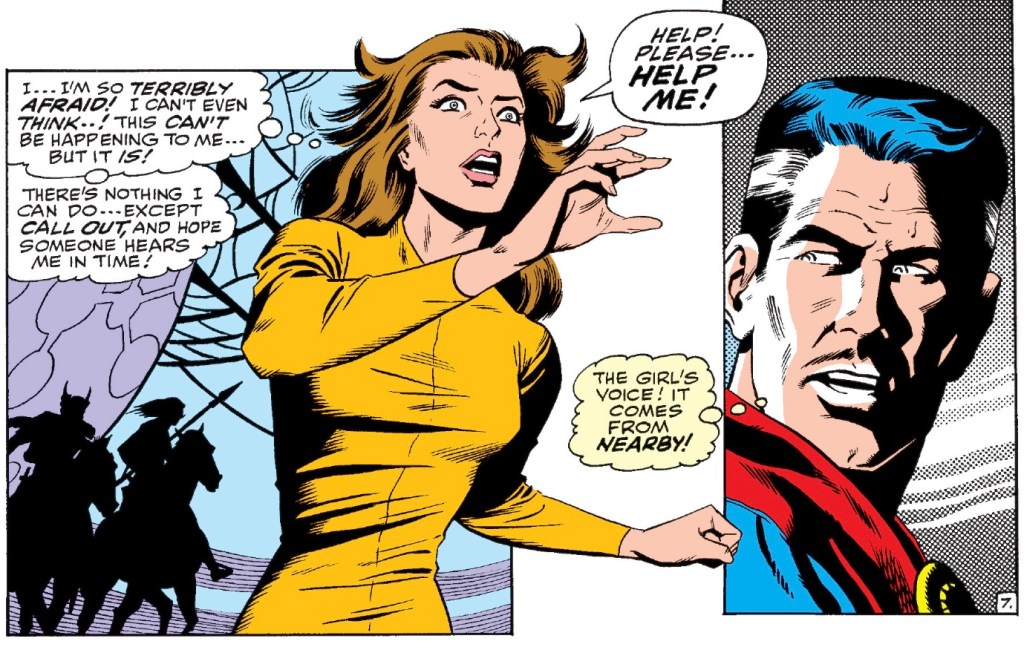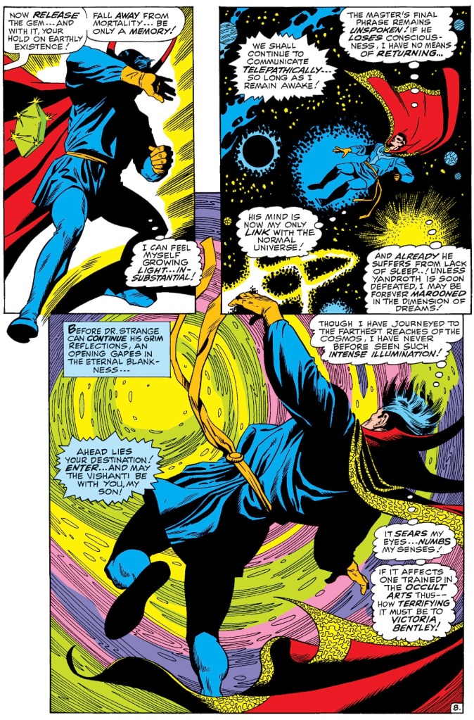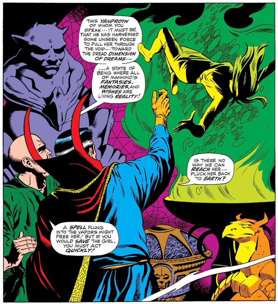 Dr. Strange carefully flies them both there and it is discovered the pair have entered the dread Dimension of Dreams! Not the one with Nightmare, a different one I guess. Strange makes an attempt to pull her out of the dimension but fails. The only choice he has is to enter it using a powerful convenient jewel and retrieve her.