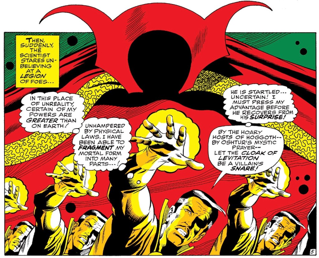 When the next issue starts, Yandroth takes the shot but because of how unstable everything is he misses. Dr. Strange plummets to the regions below and Yandroth has now brought the attention of the lizard monster to him. In the chaos of that fight Victoria is separated while Strange regains his footing and climbs back up. Yandroth kills the monster with a shot from his gun and Dr. Strange uses that distraction as an opportunity to cast a spell that replicates himself.