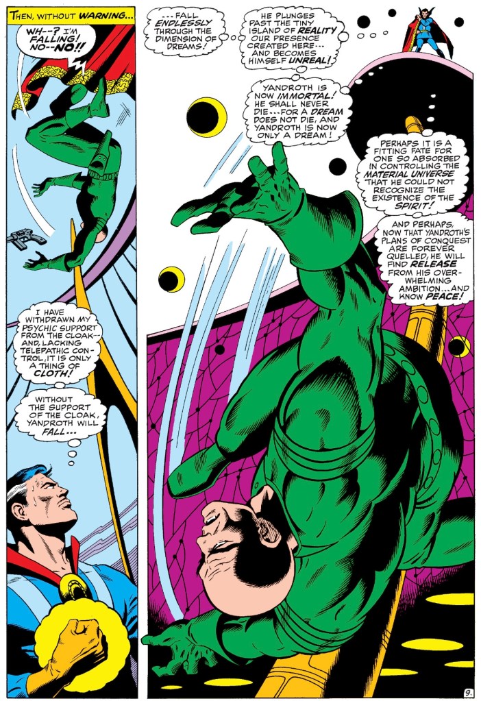 The tactic works and the Cloak of Levitation is used to bind Yandroth. While Strange is trying to get him to surrender, Victoria screams in the distance. The vikings have found her and are chasing after her. Yandroth starts to slowly regain some of his mobility and begins to grab his pistol. With no time to spare, Strange makes the difficult decision to drop Yandroth to the seemingly bottomless pits below for all eternity so that he can go after Victoria.